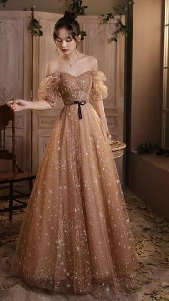 Soft, flowing fabrics like chiffon or silk create an ethereal, graceful look. These silhouettes are forgiving, flattering, and ideal for dancing, posing, and celebrating.