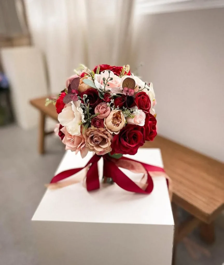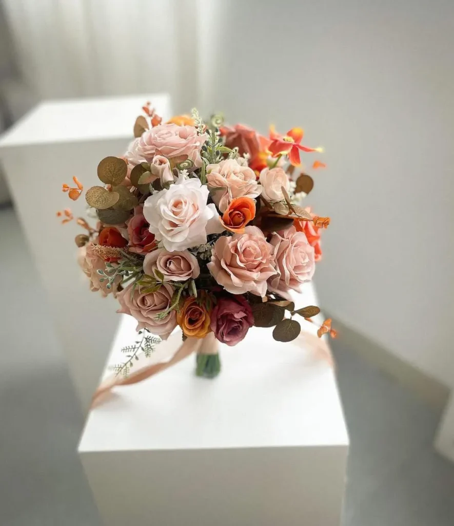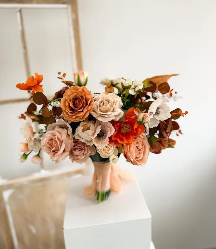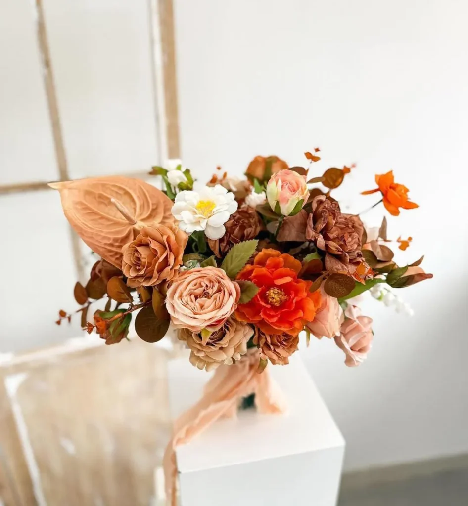 Fall is all about rich colors and textures. Use dahlias, chrysanthemums, berries, and dried elements. Earthy tones like burgundy, burnt orange, and gold create a cozy and romantic feel.