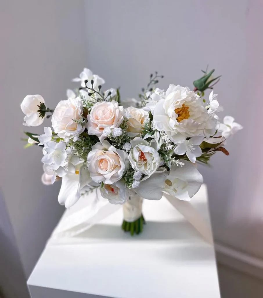 For winter weddings, white roses, pinecones, and evergreen foliage are popular. Add accents like dusty miller, anemones, or silver brunia for a frosty and elegant look.