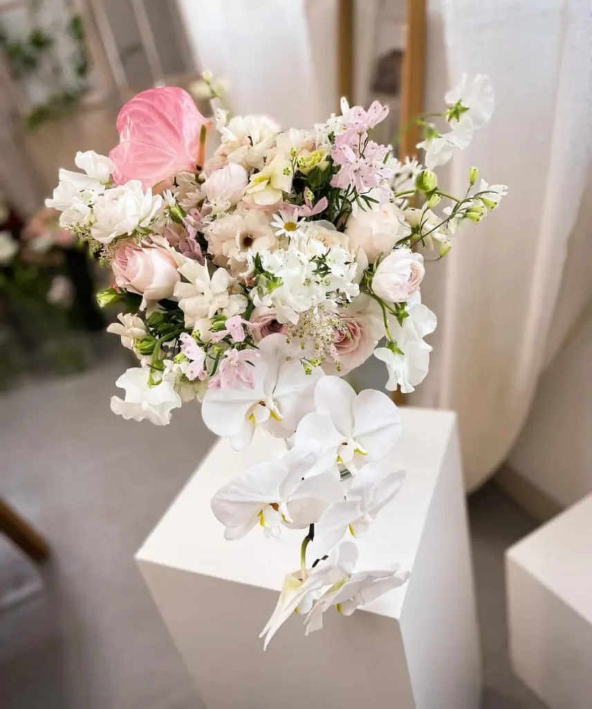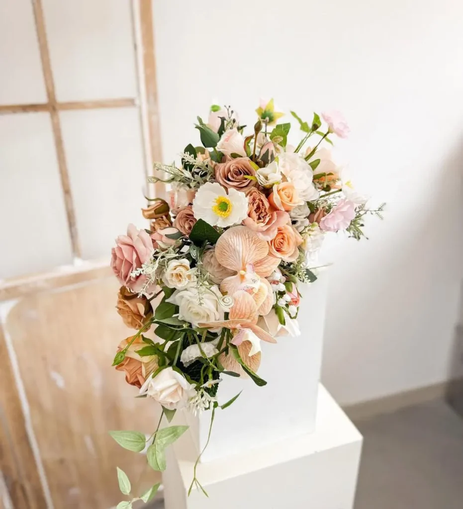 This dramatic style features flowers flowing downward, almost like a waterfall. Popular in formal weddings, cascading bouquets offer a timeless and regal feel. Orchids, ivy, and roses are often used to create this effect.