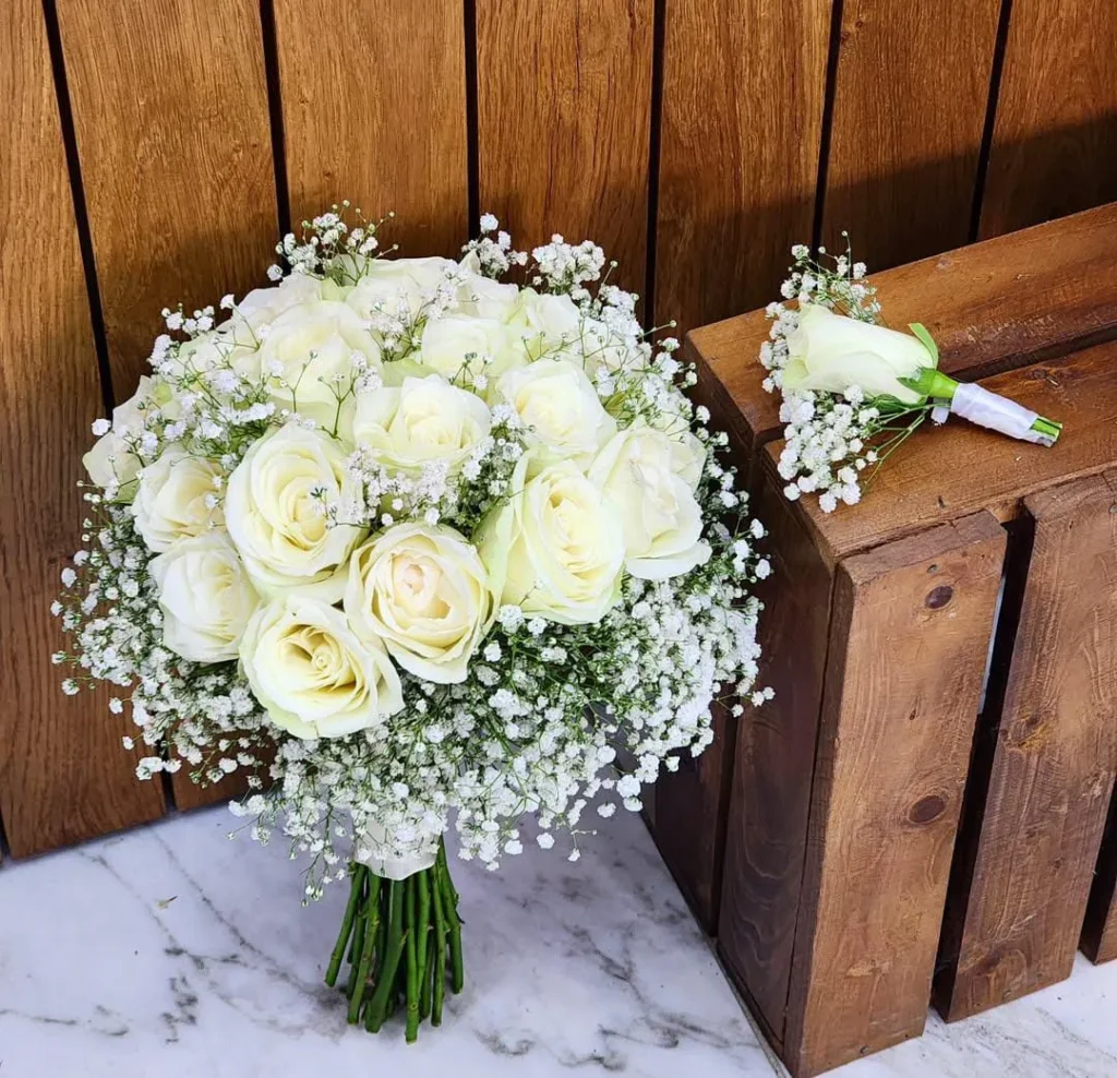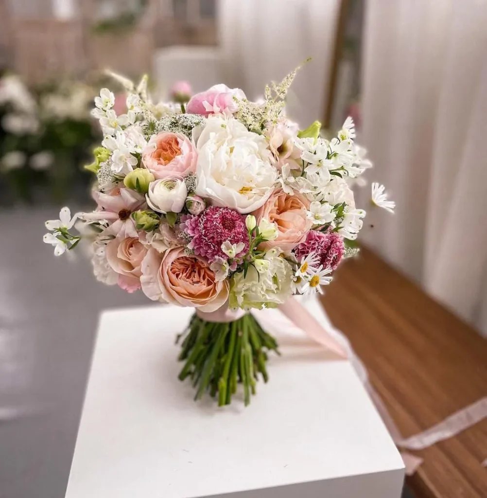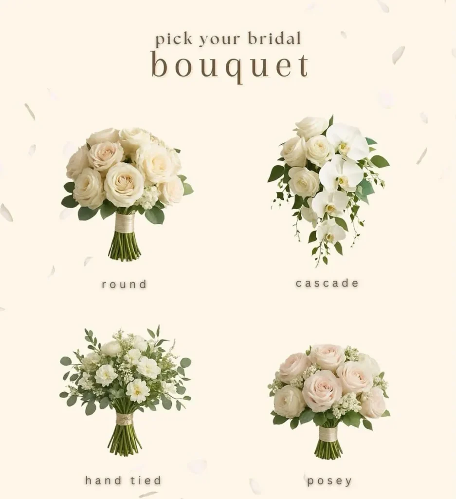 - Classic Wedding: Roses or peonies in round or nosegay styles.