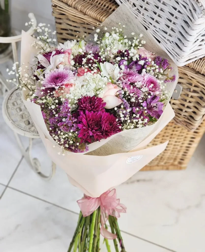 You can also mix fresh flowers with dried elements like pampas grass or lavender to add texture and uniqueness.