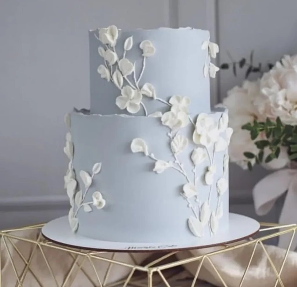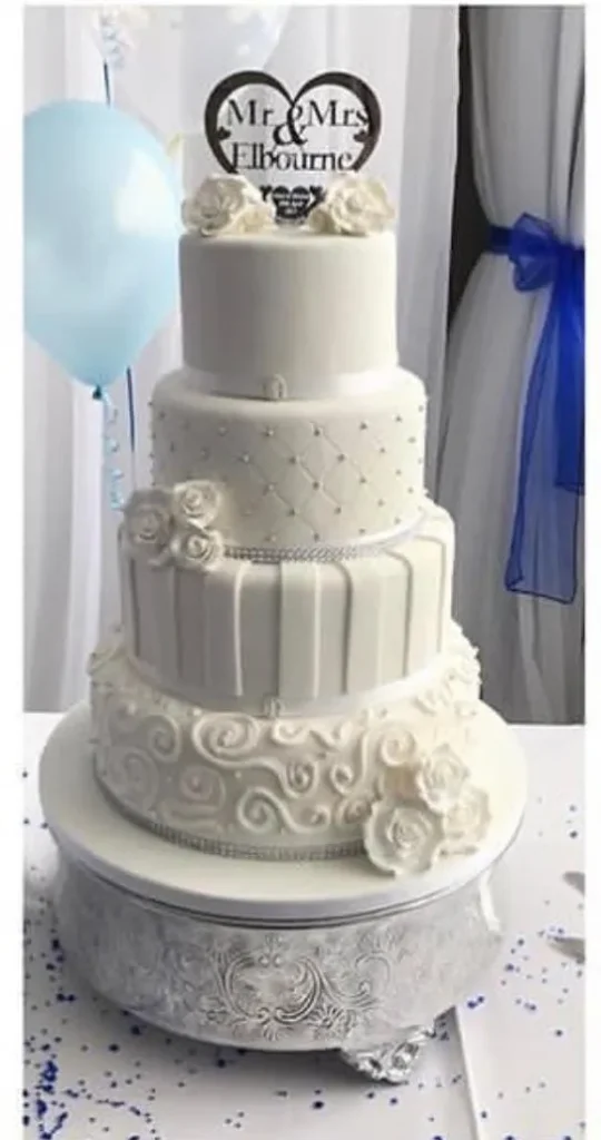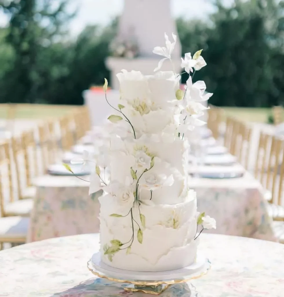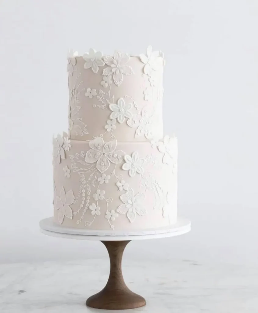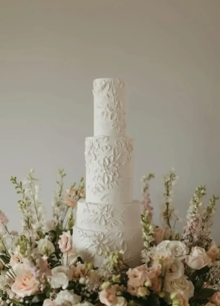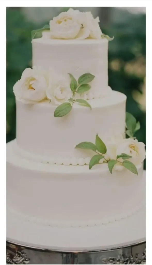 - Traditional Tiered Cake: Typically white with elegant floral details or lace-inspired patterns.