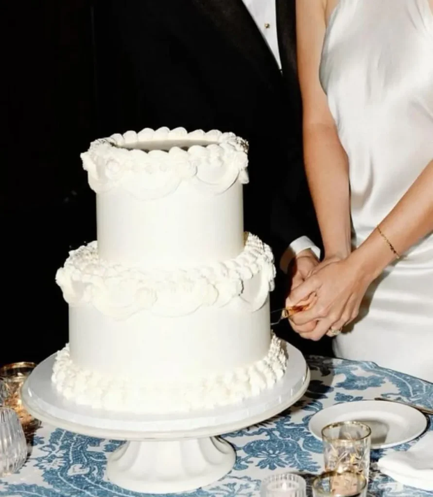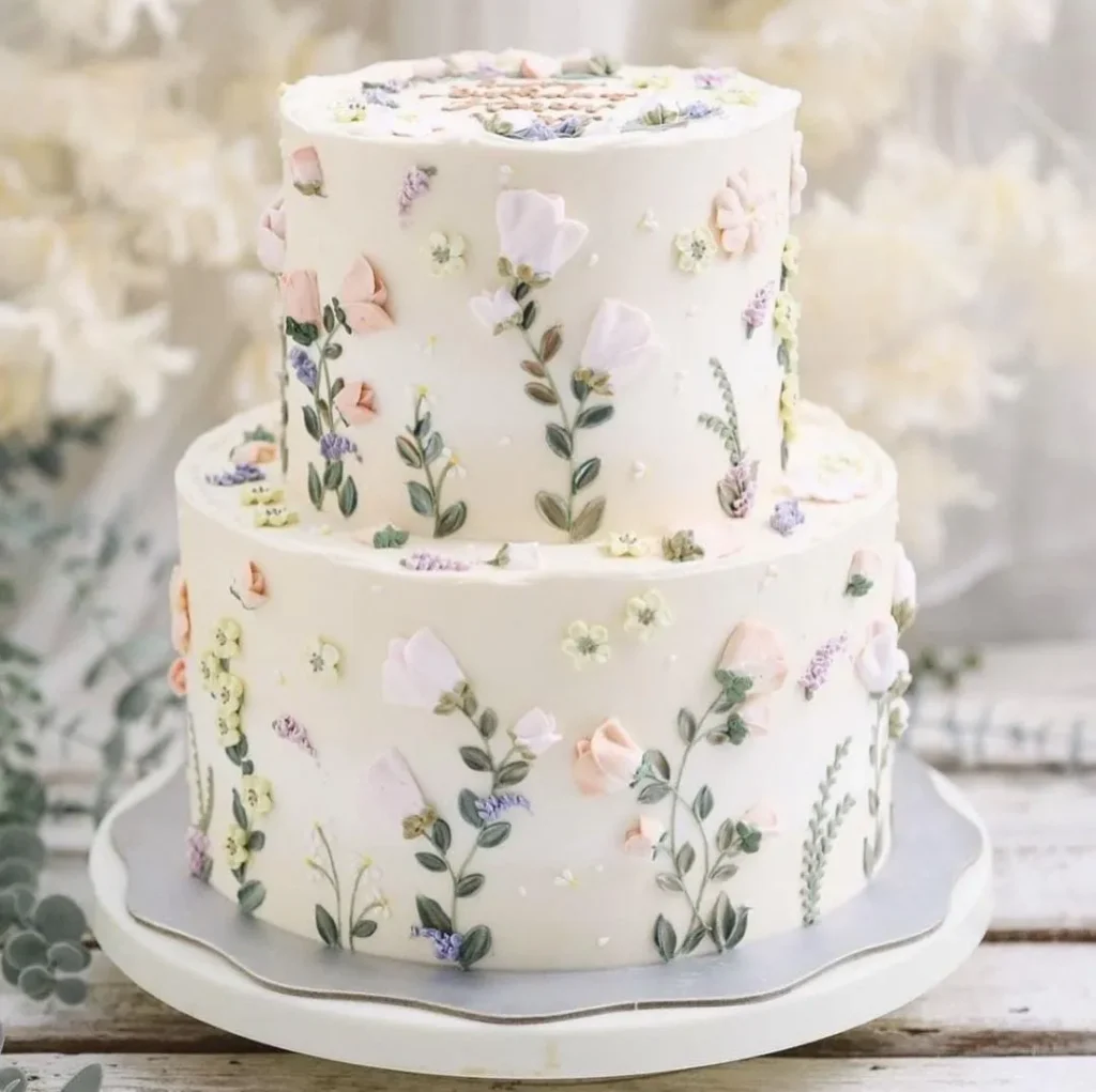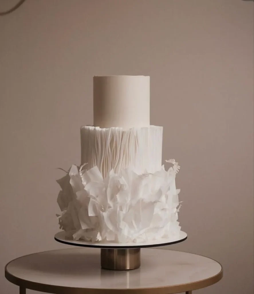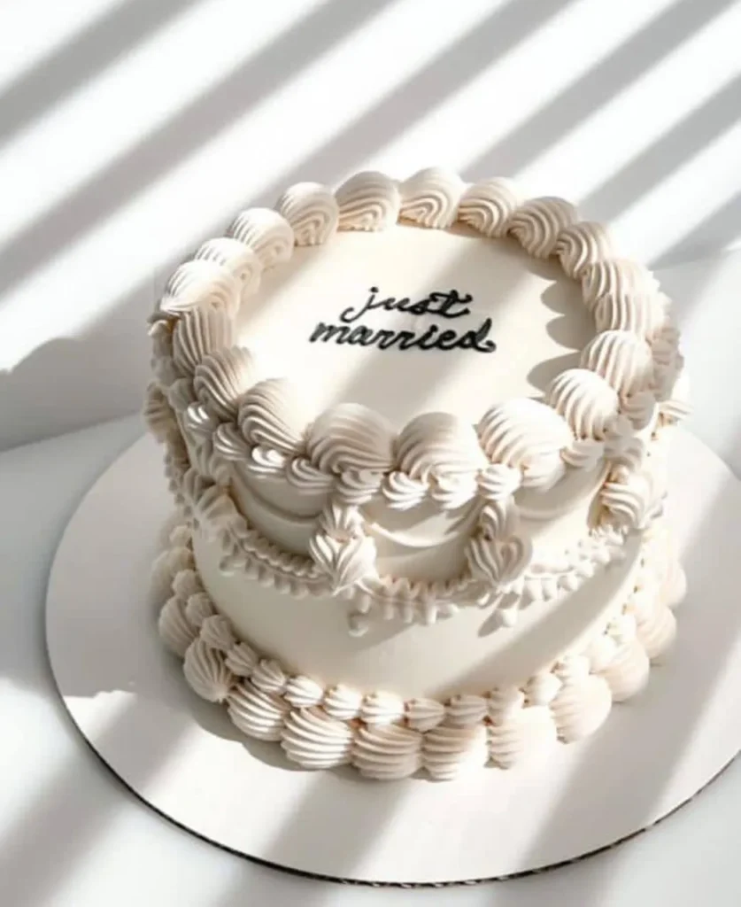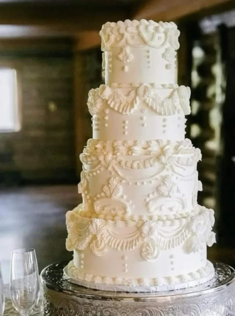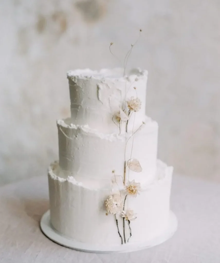 - Traditional Tiered Cake: Typically white with elegant floral details or lace-inspired patterns.